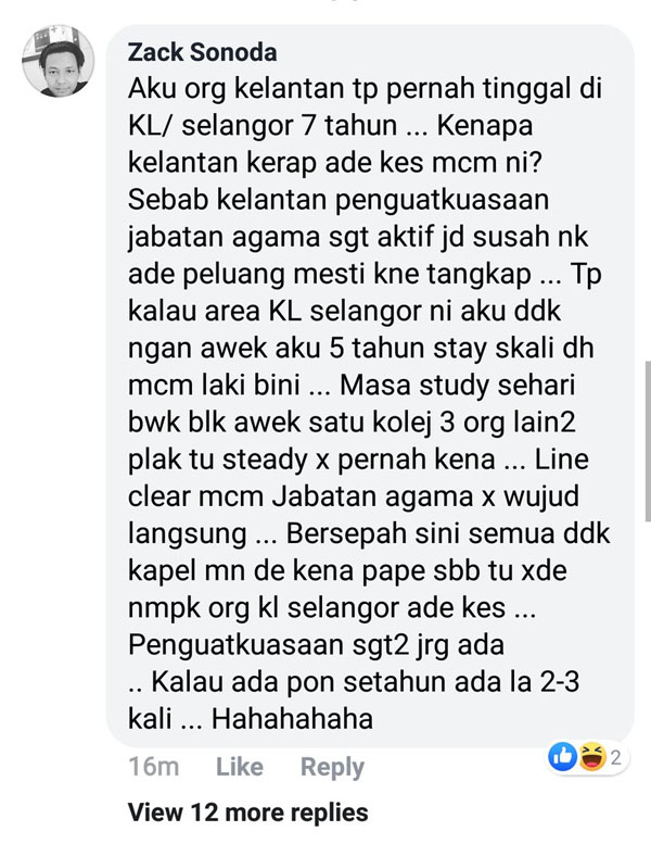 “Aku orang Kelantan, tapi pernah tinggal di Kuala Lumpur / Selangor selama tujuh tahun. Kenapa Kelantan kerap ada kes (tangkap khalwat) macam ni? Sebab Kelantan, penguatkuasaan Jabatan Agama sangat aktif. Jadi, susah nak ada peluang, mesti kena tangkap.