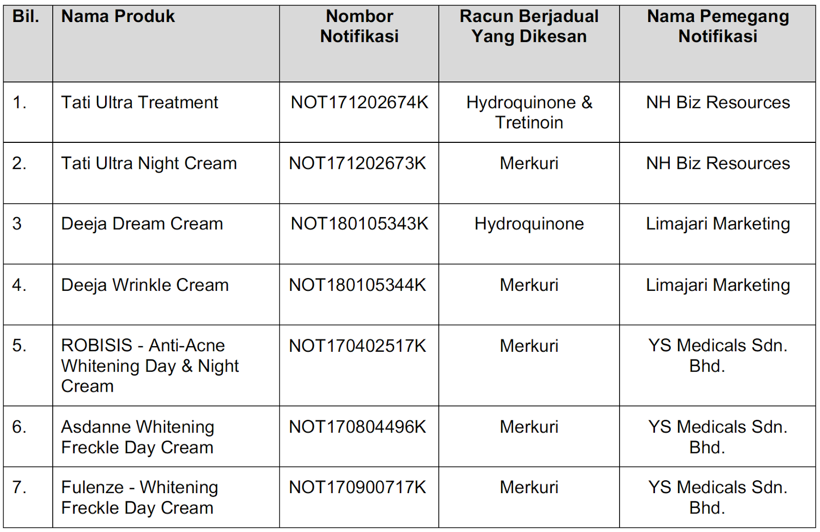 Notifikasi produk-produk kosmetik yang terlibat telah dibatalkan oleh Pengarah Kanan Perkhidmatan Farmasi, berikutan pengesanan bahan racun berjadual di dalam produk tersebut.
