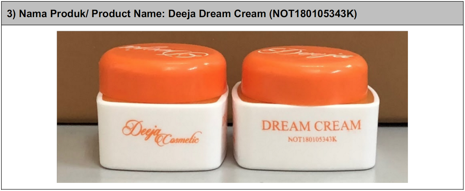 “Produk kosmetik yang dicampur palsu dengan hydroquinone lazimnya dipasarkan untuk tujuan mencerahkan kulit, merawat masalah jeragat dan kulit tidak sekata.