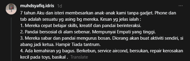 Katanya, tanpa gajet, anak-anak lebih cepat mempelajari pelbagai kemahiran dan menunjukkan tahap kreativiti yang tinggi. Mereka juga lebih bijak berinteraksi serta mampu bersosial dengan baik di dunia sebenar.