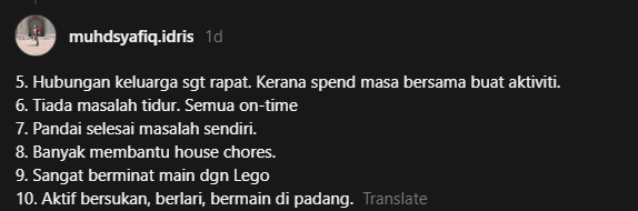 Katanya, kehidupan tanpa gajet turut menjadikan hubungan kekeluargaan mereka lebih rapat kerana banyak masa dihabiskan dengan aktiviti bersama. Anak-anak lebih seronok bermain di luar, berlari dan membina kreativiti melalui permainan seperti Lego. Tambahnya, mereka juga tidak menghadapi masalah tidur kerana semuanya sudah terbiasa dengan rutin waktu yang teratur.