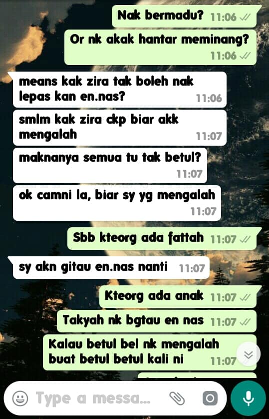Yang perempuan pun menafikan. Tapi bila dah kantoi, menangis-nangis cakap “Selama ini takut nak beritahu sebab nanti Kak Zira marah”. What do you expect? Nak sis tepuk tangan ke ha??!