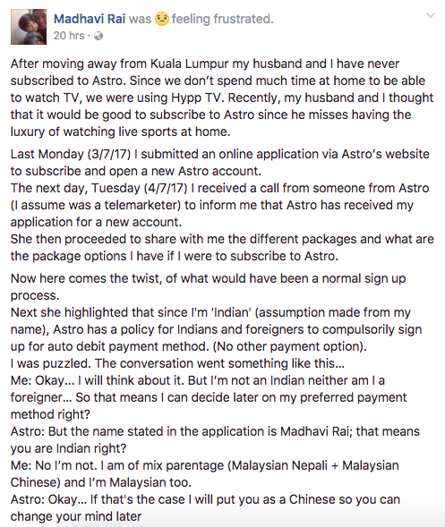 Di bawah adalah aduan Puan Madhavi Rai yang tidak berpuas hati dengan kakitangan dan polisi syarikat penyiaran televisyen swasta, Astro, yang didakwanya bersifatkan perkauman sehingga tidak membenarkan beliau melanggan perkhidmatan Astro hanya kerana enggan memilih pembayaran secara auto debit.