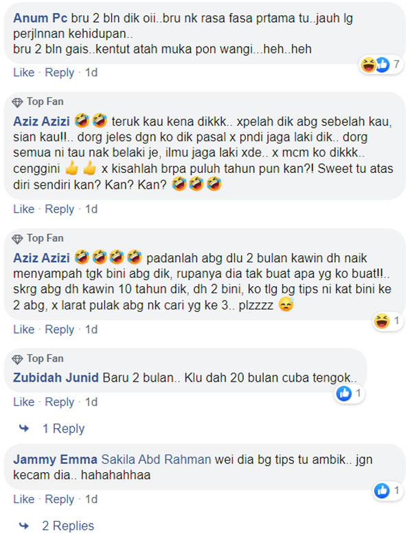 “Akak-akak kena pandai layan suami. Layan atas bawah cukup. Jaga badan, rajin mandi. Kalau ada suami, jangan main handphone. Jangan tengok tv. Layan suami je. Biar suami sayang.