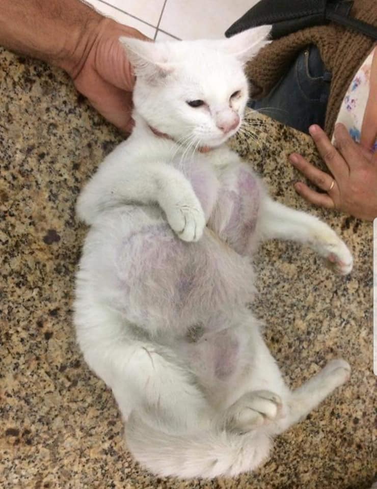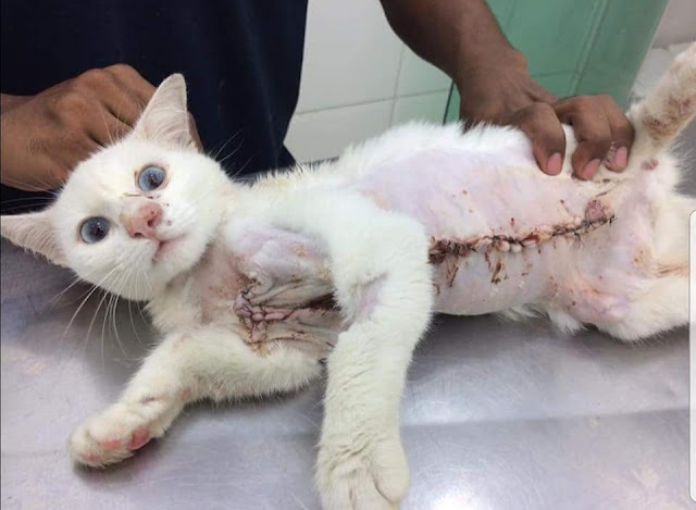 Melalui semakan di internet, gambar kejadian berlaku pada 2 September 2017 di luar negara. Difahamkan, kucing itu telah pulih sepenuhnya.