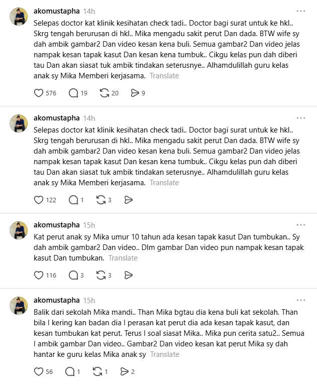 “Terus saya soal siasat Mika.. Mika pun cerita satu-satu.. Semua saya ambik gambar dan video.. Gambar-gambar dan video kesan kat perut Mika saya dah hantar ke cikgu kelas Mika,” katanya.
