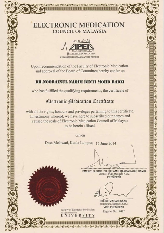 Dia dah treat ramai patient tau. Dha ramai yang terkena dengan sijil yang dia dapat, Electronic Medication of Malaysia dari Open University.