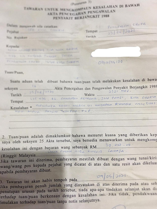 Jelas Faisal, sebelum ini dia pernah dikenakan kompaun RM1,000 dan kompaun terbaru yang bernilai RM50,000 ini merupakan kes berulang. Semenjak PKP tahun lalu, Faisal mula berniaga di depan rumah yang juga merupakan satu-satunya punca rezeki dia.