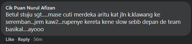 “Kepada yang menunggang basikal ini, kalau korang nak mengayuh pun silalah beringat. Ini jalan bandar dan hari hujung minggu kenderaan memang banyak sangat dan berbahaya.