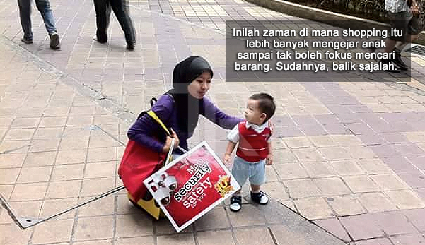 Ini saya, enam tahun yang lalu dengan anak sulung yang baru berusia setahun. ‘Baru dapat kaki’ lagi dia pada masa ini. Inilah zaman di mana shopping itu lebih banyak mengejar anak sampai tak boleh fokus mencari barang. Sudahnya, balik sajalah.