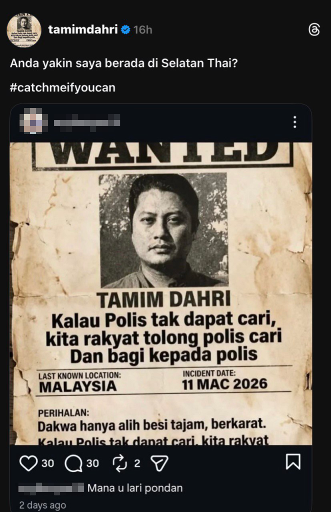 Perkongsian berkenaan turut memaparkan poster ‘Wanted’ yang menyenaraikan nama Tamim Dahri sebagai individu yang dikehendaki. Poster itu turut menyatakan lokasi terakhir sebagai Malaysia serta tarikh kejadian pada 11 Mac 2026.