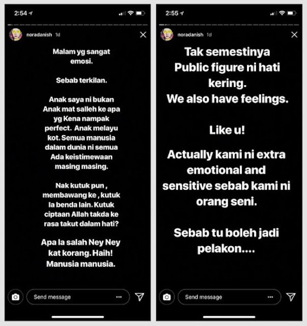 “Apalah salah Ney Ney kat korang. Haih! Manusia, manusia,” tulis Nora.