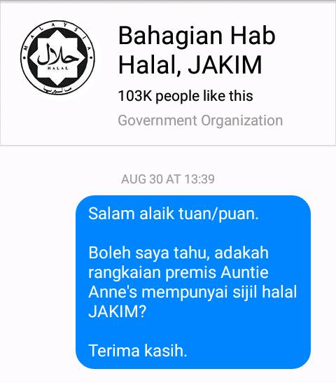 Dalam maklumbalas JAKIM pada 4 September lalu menyatakan bahawa premis Auntie Anne’s bukan pemegang Sijil Pengesahan Halal Malaysia.