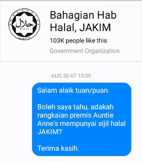Azizah Mohamed semalam memuat naik beberapa screenshot yang menunjukkan bahawa Bahagian Hab Halal JAKIM telah memberikan respon terhadap persoalannya pada 30 Ogos lalu bahawa Auntie Anne’s tidak memegang sebarang sijil halal dari JAKIM.