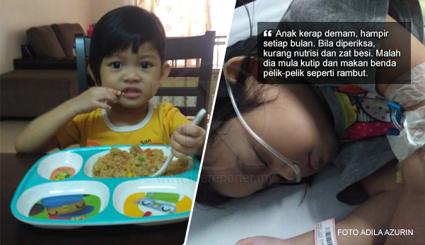 Perkongsian dari Puan Adila Azurin di bawah adalah mengenai anaknya yang mengalami anemia. Setelah diperiksa pihak hospital, anaknya mengalami kekurangan nutrisi. Selain itu, anaknya juga dikatakan mempunyai simptom-simptom PICA, penyakit di mana seseorang itu suka makan benda-benda pelik. Seseorang yang kurang zat besi cenderung untuk dapat simptom macam ni.