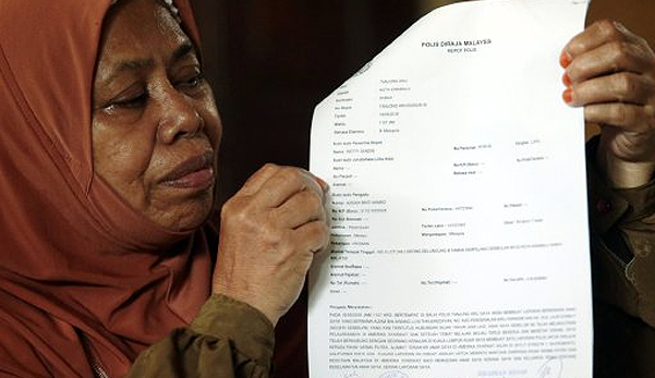 | Azizah menunjukkan laporan polis akan kehilangan anaknya, Aizam | Foto – Berita Harian |
