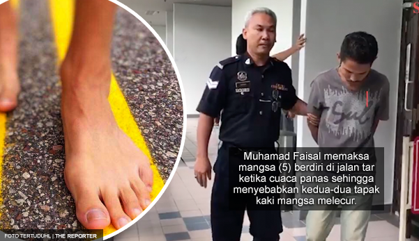 Muhamad Faisal didakwa di atas tuduhan mendera mangsa yang di bawah tanggungannya, dengan memaksa mangsa berdiri di jalan tar ketika cuaca panas sehingga menyebabkan kedua-dua tapak kaki mangsa melecur.