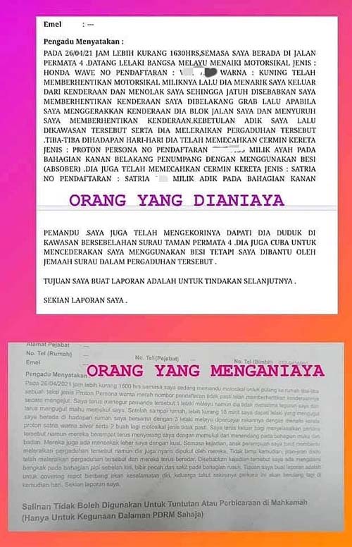 Berdasarkan salinan laporan polis dari kedua-dua pihak, laporan yang dibuat oleh dua mangsa adalah sama dengan laporan berita di atas. Berbeza dengan laporan polis yang dibuat oleh suspek yang langsung tidak menyatakan kejadian memecahkan cermin kenderaan mangsa.