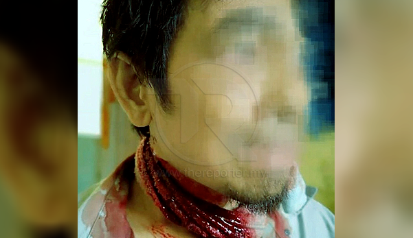 Dalam kejadian yang berlaku pada jam 7 pagi kelmarin di sebuah unit pangsapuri di Taman Telipok Ria, Tuaran, Sabah, mangsa berusia 54 tahun cedera di bahagian leher terpaksa menerima 14 jahitan di kiri dan empat jahitan di sebelah kanan lehernya ketika mendapatkan rawatan di Hospital Queen Elizabeth 1.