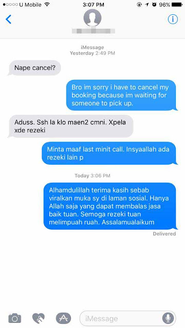 Saya sertakan gambar bukti bahawa saya telah membatalkan tempahan dan meminta maaf kepada pemandu berkenaan pada hari kejadian. Kalau pemandu Grab Car / Uber menyangka saya berniat untuk bermain dengan tempahan palsu, harap maaf. Bukan niat nak bermain dengan aplikasi Grab Car/Uber.