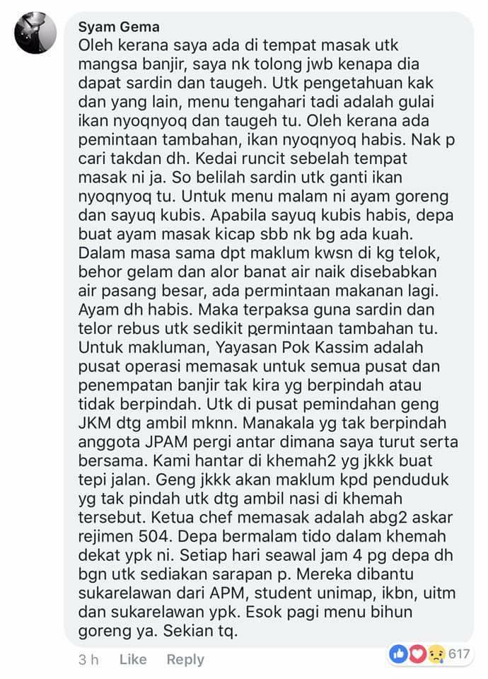 “Oleh kerana saya ada di tempat masak untuk mangsa banjir, saya nak tolong jkawab kenapa dia dapat sardin dan taugeh. Untuk pengetahuan kakak ini dan yang lain, menu tengah hari tadi adalah Gulai Ikan Nyoqnyoq dan taugeh itu. Oleh kerana ada permintaan tambahan, ikan nyoqnyoq habis. Nak pergi cari, takdan dah. Kedai runcit sebelah tempat masak ini saja. Jadi belilah sardin untuk ganti ikan nyoqnyoq itu.