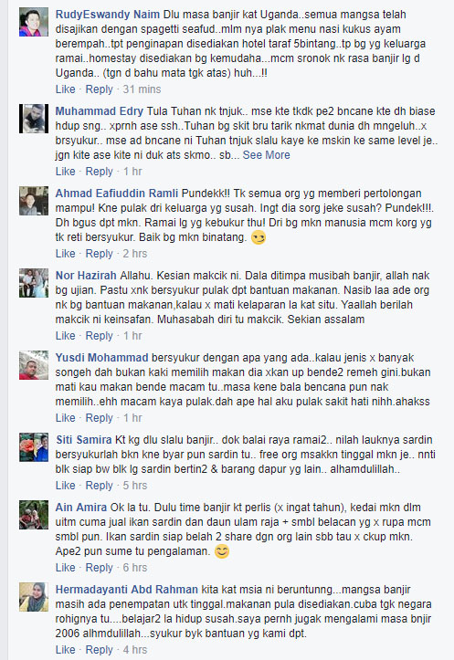 “Itu dah kira sedaplah, asal dapat makan. Saya dulu pun mangsa banjir juga. Duduk di sekolah rendah hampir seminggu pada tahun 2006. Masa itu banjir besar di Muar, Johor. Makan pagi lain, makan tengah hari lain, takkan setiap masa nak makan ay am daging ikan mahal-mahal? Nama pun banjir, makan saja apa yang ada. Untung ada dari tak ada,” kata Khairiah Safie Nur Kaseh.