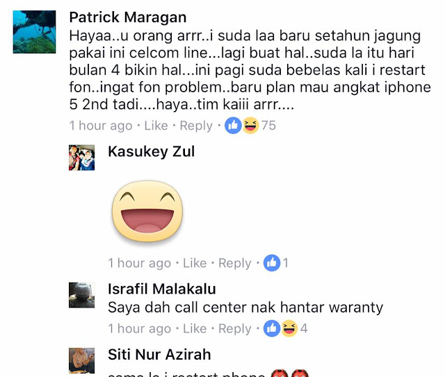 Sementara itu diruangan komen status Facebook Celcom, salah seorang penggunanya yang terjejas, Patrick Maragan, juga hampir saja membeli telefon baru kerana menyangka telefonnya bermasalah.