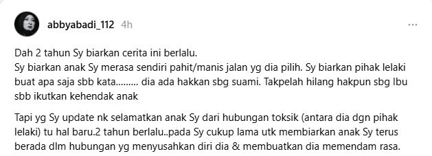 “Apa yang saya update ini nak selamatkan anak saya dari hubungan toksik (antara dia dengan pihak lelaki). Dua tahun berlalu, pada saya cukup lama untuk membiarkan anak saya terus berada dalam hubungan yang menyusahkan diri dan membuatkan dia memendam rasa,” ujarnya.