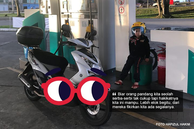 “Haa tahu pun. Ingat, motosikal bukan tanda orang itu miskin. Kadang-kadang orang berkereta pun pening sebab dah masuk 3 bulan tak bayar bank. Tunggu masa kereta kena tarik. Skuter daddy dah habis bayar lama dah.”