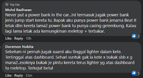 Orang ramai diingatkan untuk tidak meletak atau meninggalkan power bank atau sebarang barangan yang mudah meletup di dalam kereta kerana kejadian seumpama ini sudah kerap kali berlaku sehingga ada yang melibatkan kehilangan nyawa.