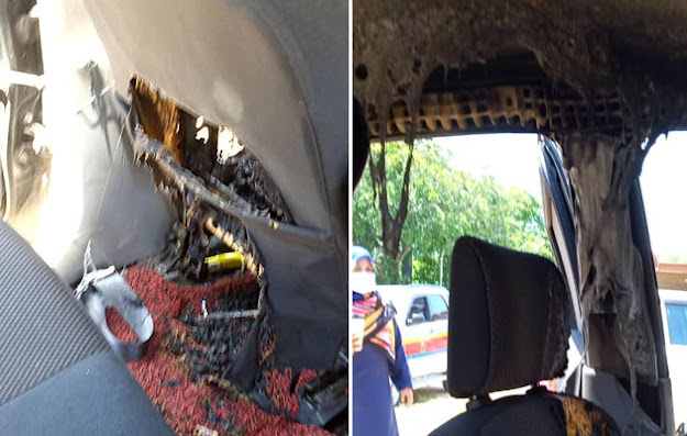 Menurut sumber, power bank yang diletakkan di bahagian ruang simpanan tempat duduk penumpang belakang meletup secara tiba-tiba.