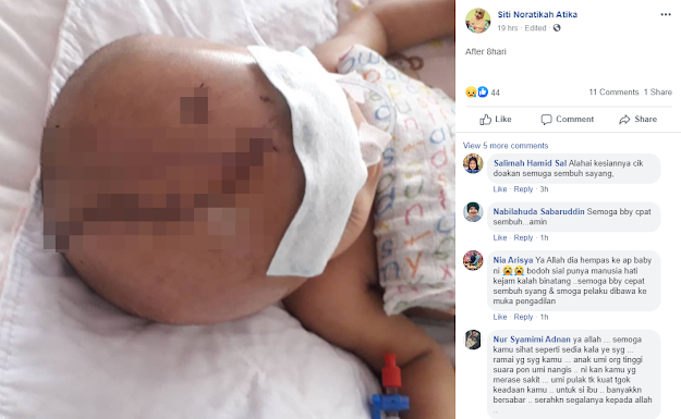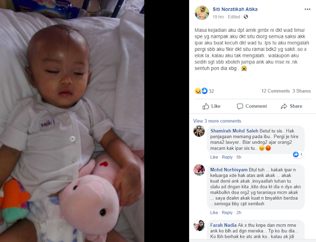 Luluh hati wanita ini bila melihat anaknya hanya terbaring kaku dengan jahitan di kepala. Hanya dapat melihat dari kejauhan, dia begitu marah dengan kejadian yang menimpa anaknya, lebih-lebih lagi apabila dia dimaklumkan bahawa tempurung sebelah kanan anaknya sudah tiada.