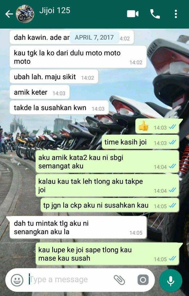 Selepas perbualan di WhatsApp itu, aku ada cuba menghubungi dia lagi dan bertanyakan khabar. Aku ingat dia akan lupakan peristiwa itu dengna aku. Kali ini dengan sangat ketara terutamanya cara dia bersmebang, memang jauh sekali berbeza. Dengan lagaknya, nadanya memarahi aku, seperti bercakap dengan orang asing. Padahal aku ini sahabat kau dulu bro!
