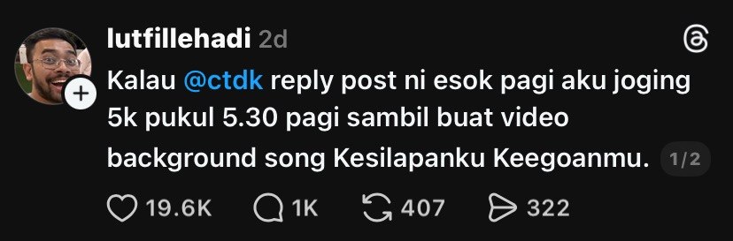 Dalam hantaran asalnya, lelaki berkenaan berseloroh jika penyanyi nombor satu negara itu perasan dan membalas hantaran tersebut, dia sanggup bangun awal untuk berjoging sejauh 5 kilometer pada jam 5.30 pagi, lengkap dengan video berlatarbelakangkan lagu Kesilapanku Keegoanmu.