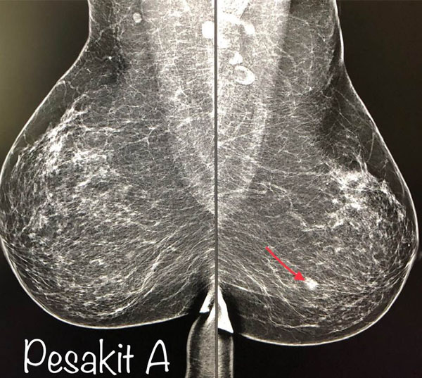 Dari segi kesan pada pemeriksaan mammogram, lihat gambar pesakit A, tak pernah ambik apa-apa suntikan, kecil saja biji kat payudara (anak panah) dah boleh nampak. Ketulan ini kurang dari 1 sentimeter, memang pemeriksaan payudara tak dapat nak rasa pun biji. Tapi mammogram boleh tunjukkan.