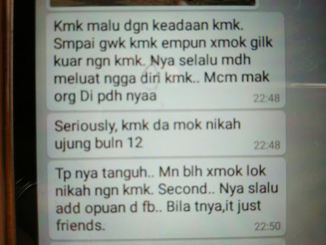 Kalau dari awal sudah mula menunjukkan sikap malu hendak keluar dengan pasangan, macam mana jika sudah berkahwin kelak? Jangan hanya suka semasa cantik sahaja, itu bukan cinta namanya. Itu menempah malapetaka cik adik oi!