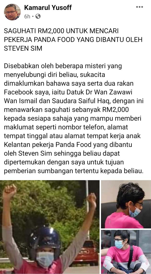“Saguhati RM2,000 untuk mencari pekerja Food Panda yang dibantu oleh Steven Sim.