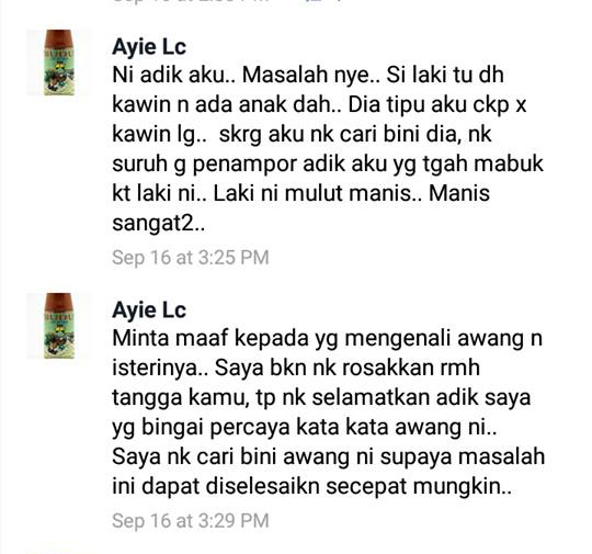 Allahyarham Muhamad Shukri merupakan anak kedua dari sembilan beradik, tidak mahu adiknya, Azlina, ditipu dan berkahwin dengan suami orang. Allahyarham sebelum itu pernah memuat naik status di akaun Facebook miliknya, Ayie Lc, yang mahu mencari isteri kepada teman lelaki adiknya itu pada 6 September lalu.