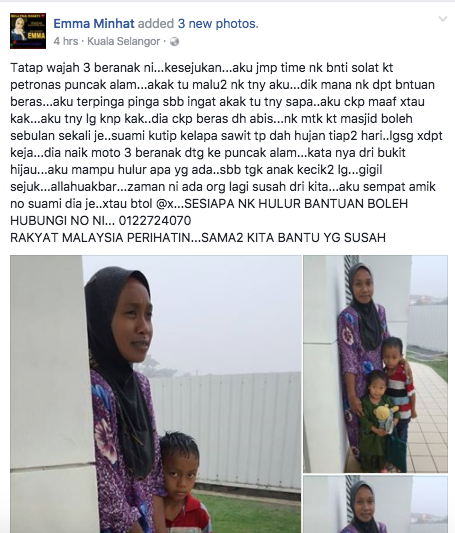 Emma Minhat, tidak menyangka yang seorang ibu bersama dengan dua anak kecilnya itu yang meminta bantuan beras kerana barangan dapur mereka sudah habis. Tambahan pula, suaminya yang bekerja mengutip buah kelapa sawit itu sudah beberapa hari tidak berkerja kerana hujan.