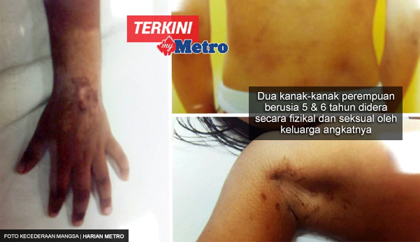 Dua beradik perempuan malang yang berusia lima dan enam tahun didera oleh keluarga angkatnya dan hanya diketahui selepas pihak Klinik Kesihatan Sungai Bayor membuat pemeriksaan kesihatan terhadap mereka di tadika kawasan berkenaan jam 4 petang Isnin.