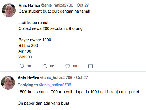 Berdasarkan ‘pakar hartanah’ itu di Twitter juga ada mengajar golongan pelajar IPT buat duit dengan hartanah di mana mereka perlu menjadi ketua rumah dan mengumpul duit sewa RM200 sebulan dari sembilan rakan serumah sewa.