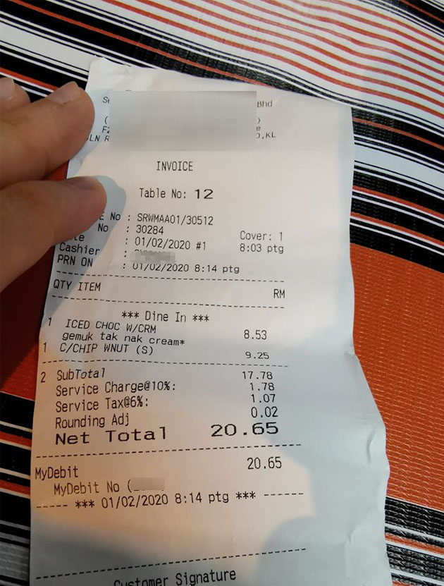 “Bayangkan kalau pelanggan lain yang cerewet dapat resit seperti ini. Tak salah untuk bergembira di tempat kerja tetapi tolonglah profesional.”