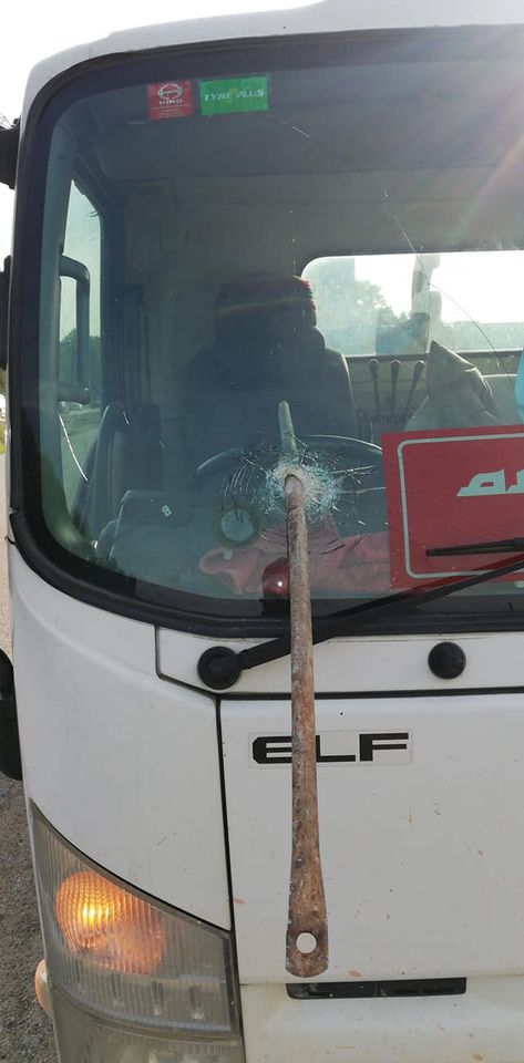 Menurut sumber, batang besi tersebut terjatuh dari muatan lori dan dilanggar oleh kenderaan lain lalu tercampak dan menusuk cermin hadapan nyaris menusuk dada pemandu.