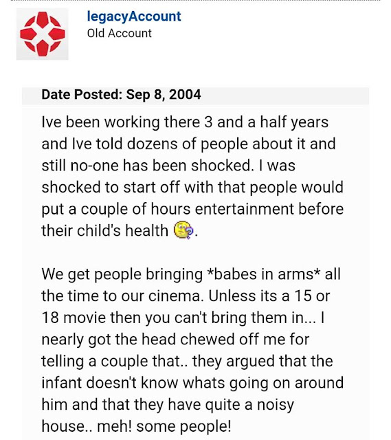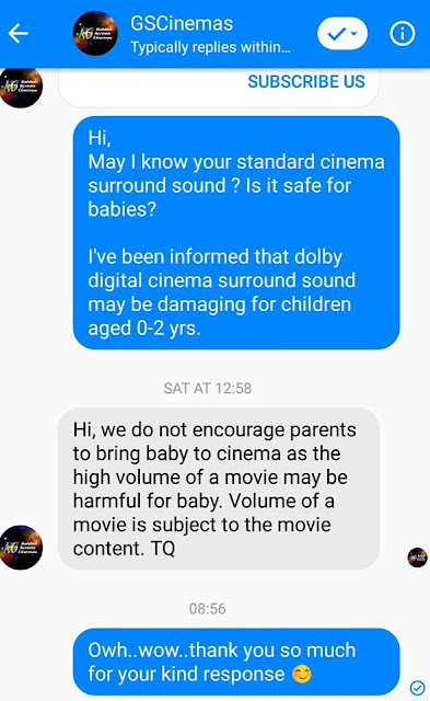 Screenshot pertama ialah balasan mesej dari GSC cinema Malaysia kepada saya sendiri. Dua screenshot terakhir adalah pengakuan pekerja panggung wayang di luar negara. Kedua-duanya mengesahkan hal yang sama iaitu, panggung wayang bukan tempat buat anak-anak berusia dua tahun ke bawah.