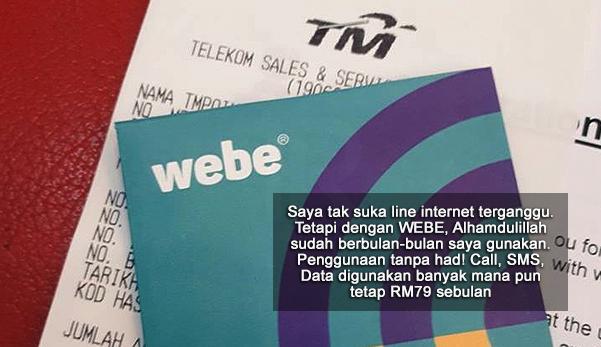 Suatu hari nan indah, suami sarankan sesuatu. Saya cuma dengar dan segera bersetuju. Kami segera pergi ke Telekom Malaysia, mendaftar line baharu. Webe, ya, Alhamdulillah sudah berbulan-bulan saya menggunakan line ini. Pakej RM79 sebulan untuk penggunaan tanpa had! Call, SMS, internet banyak mana pun, bayaran bulannya masih dan tetap RM79.