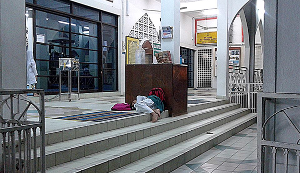 Kasihan aku tengok budak ini, masih berbaju sekolah agama tertidur di tangga masjid menunggu ibu bapanya datang menjemputnya.