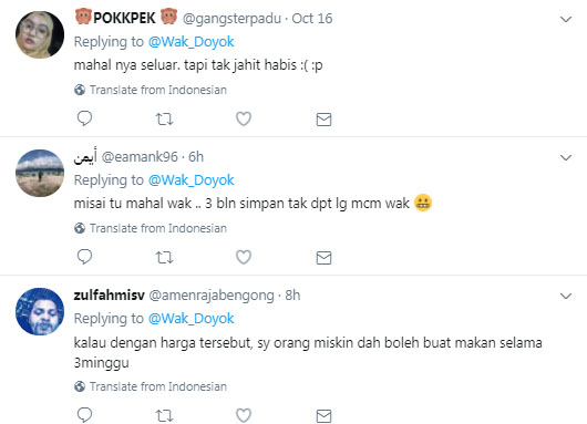 “Mahalnya seluar. Tapi tak jahit habis,” tulis Pokkpek.