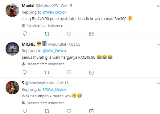 “Seluar koyak pun RM100 lebih? Kakek dia barang murah. Murah bagi awak laa. Seluar RM149.90 pun koyak lutut. Kalau tak koyak tu, mau RM300,” kata netizen.