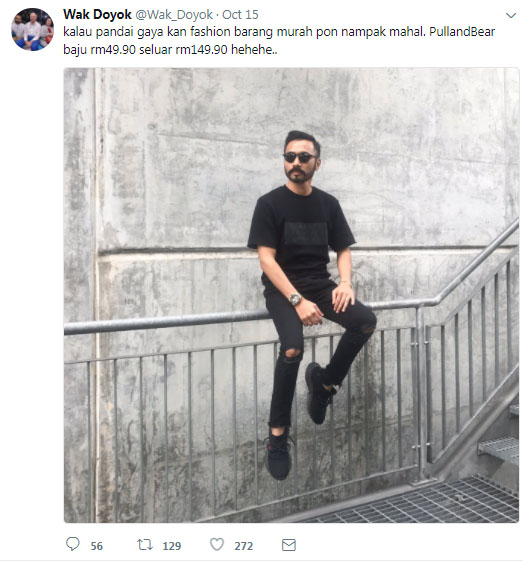 “Kalau pandai gayakan fashion barang murah pun nampak mahal. PullandBear baju RM49.90, seluar RM149.90. Hehehe..” tulisnya.