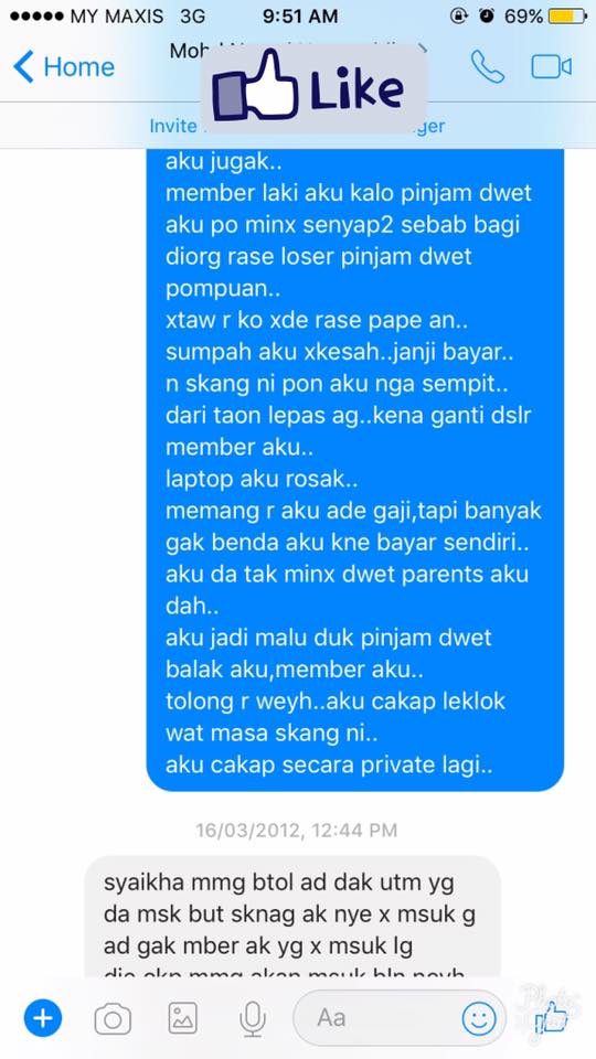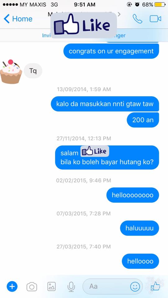 Alahai hanatnye perangai. Aku tak pernah minta kau bayar sekaligus der. Rm10 sebulan pun aku terima weyh. Yang buat aku lagi bengang, kau senyapkan diri. Eh? Kita pula yang nak kena merayu-rayu kat dia.